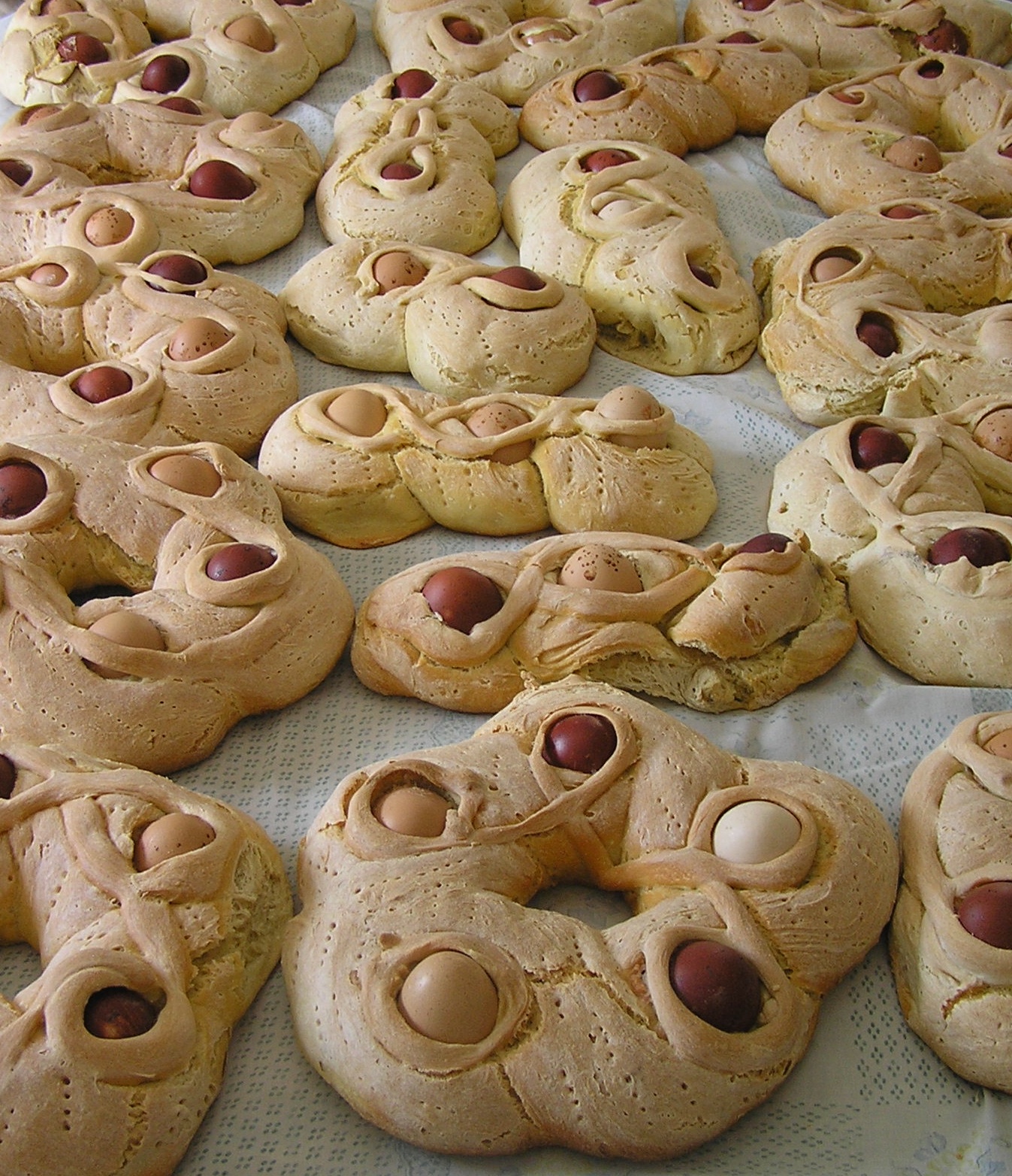 The ‘cuddurunni’ bread decorated with eggs (some coloured red from boiling them with the root of a native plant) is the traditional Easter gift.